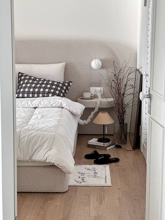 공간이 협소하기에 가구 배치를 자주 바꿀 수 없으니 기본적인 요소에서 감성을 살리고자 했고, 안방은 넓어 보이는 것보다 아늑하게 느껴지는 것이 중요하다고 생각했기 때문이에요.