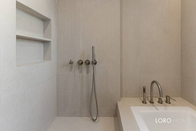 업체에서 공사 직후 찍어주신 샤워실+욕조 공간 정면 모습입니다. 좌측으로는 매립 선반을 둬서 사용하는 욕실용품들을 배치해두니 욕실 전체가 깔끔해 보여요.