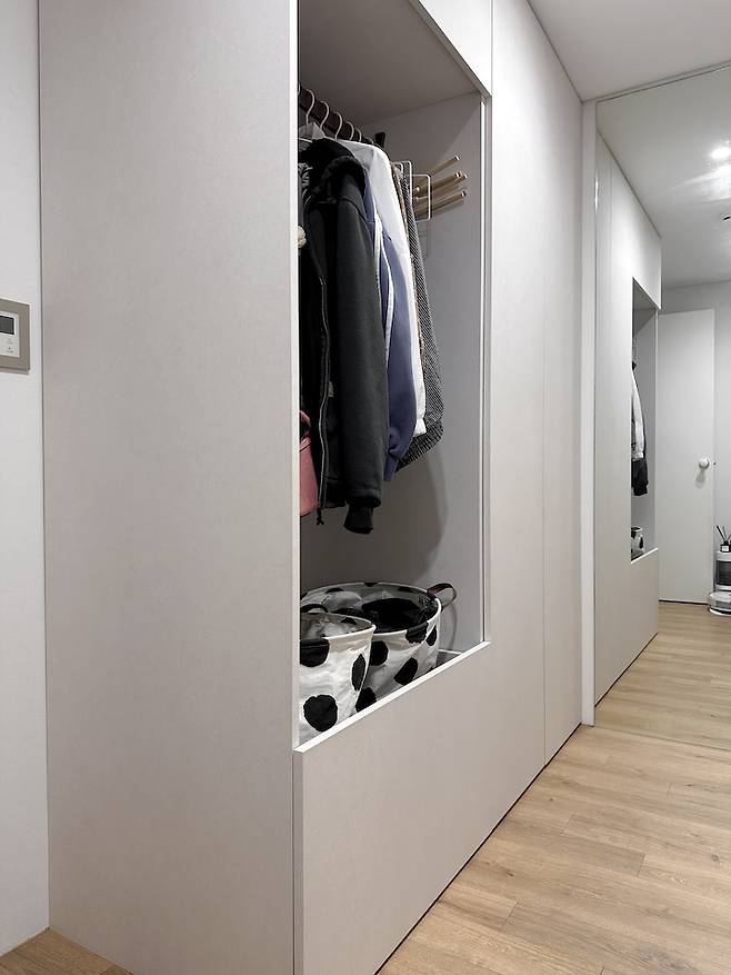 맞은편 붙박이장에는 오픈장을 두어 아래에는 빨래 바구니를 두고, 상부에는 입었던 옷이나 자주 사용하는 걸 수 있게 했어요. 그리고 붙박이장 내부 역시 미리 정리할 계획을 시뮬레이션 한 후 저희에게 딱 맞는 구성으로 주문 제작했어요.