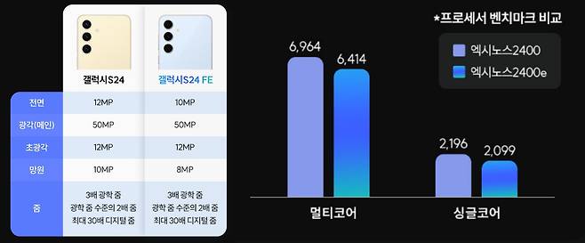 두 모델의 가장 대표적인 차이는 칩셋이다. 갤럭시 S24 FE 모델에 탑재된 엑시노스 2,400e는 갤럭시 시리즈에 들어간 엑시노스 2,400보다는 낮은 성능의 제품이다. 벤치마크 점수 기준으로 약 5~10% 차이가 있다.