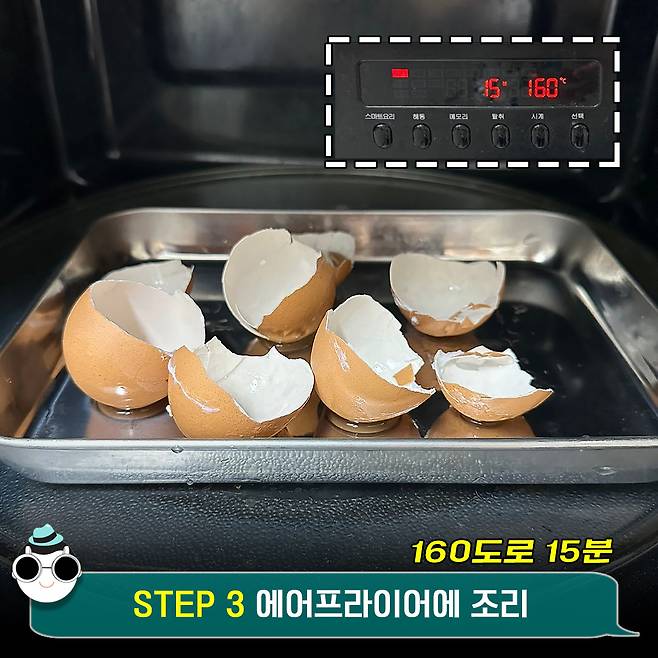 이 경우에는 깨끗하게 씻고 끓인 물에 소독한 계란껍질을 에어프라이어에 넣는 대신 하루 정도 햇볕에 말려주세요.