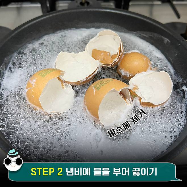 이어 냄비에 계란껍질을 담아준 뒤 물을 부어 끓여주세요.