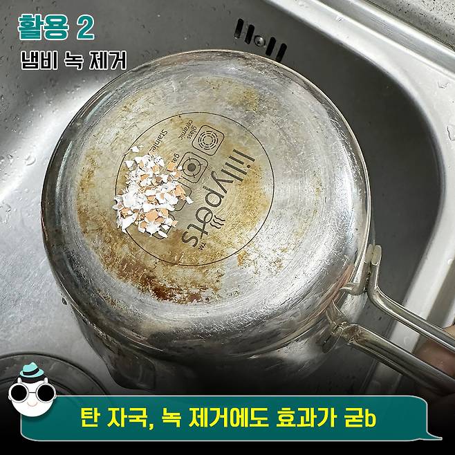 계란껍질에 넣은 구연산 덕분에 탄 자국, 녹 제거도 가능한데요.