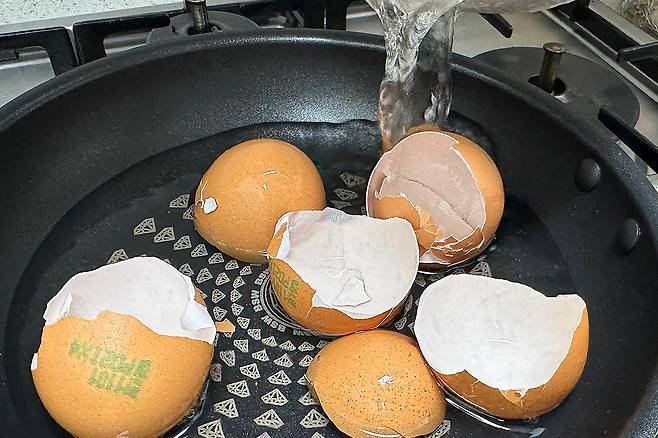 계란 껍질을 흐르는 물에 헹궈주세요.