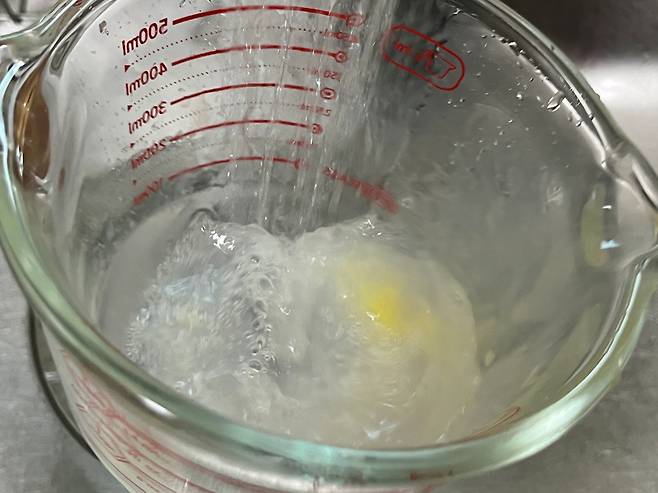 1차 세척 시 중요한 것은 반드시 찬물로 헹구어 남은 계란을 없애는 것입니다. 세제 없이 물로만 헹구어 계란 잔여물을 없애 주세요.