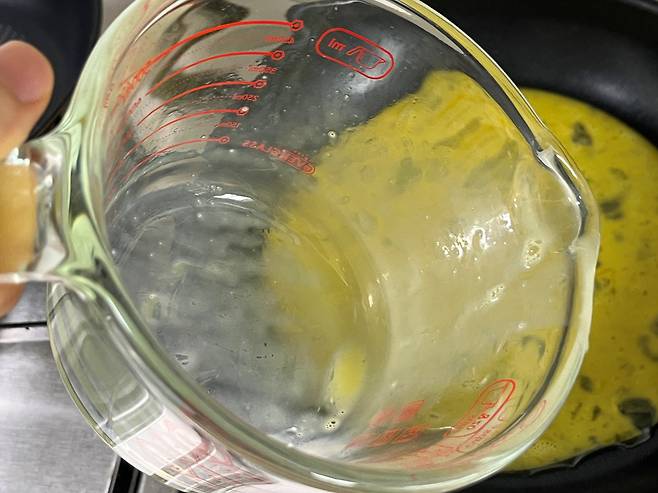 계란을 풀었던 그릇입니다. 이 그릇 그냥 두면 계속 비린내가 심해지더라고요. 계란 닿았던 그릇은 바로 1차 세척을 해야 합니다.