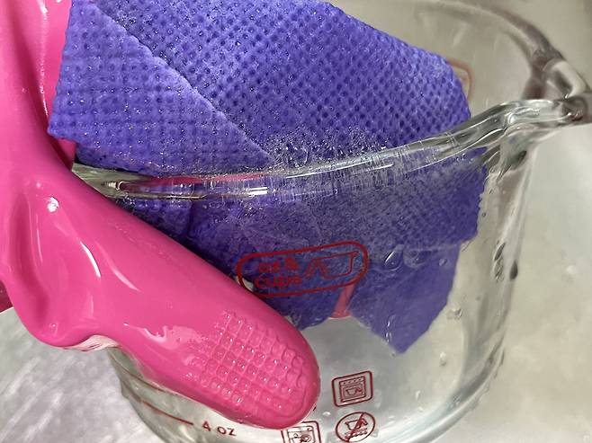 뜨거운 물로 헹궈낸 후 세제 묻힌 수세미로 가볍게 닦아 냅니다. 확실히 식초와 뜨거운 물로 씻어내면 효과가 있습니다.