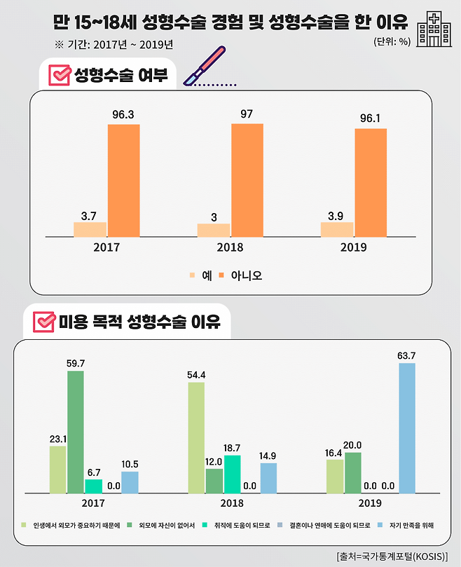 통계에서도 이 같은 흐름은 확인된다. 국가통계포털(KOSIS)에 따르면 만 15~18세 청소년 가운데 성형수술 경험 비율은 2017년 3.7%에서 2019년 3.9%로 증가했다. 같은 기간 미용 목적의 성형수술 비율도 88.7%에서 92.9%로 4.2%포인트 늘어 성형이 의료적 필요보다는 외모 개선을 위한 선택으로 이뤄지는 경향이 더욱 뚜렷해졌다.
