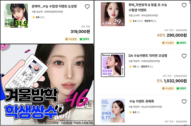 지난달 대학수학능력시험이 끝난 이후 강남역과 압구정 등 성형외과 밀집 지역에서는 수험생과 청소년을 겨냥한 각종 성형 프로모션이 본격적으로 등장하고 있다. 대학 진학과 면접을 앞둔 학생들이 외모 개선을 목적으로 성형수술을 선택하는 사례가 늘면서, 성형외과 업계는 수능 직후부터 겨울방학 기간을 대표적인 ‘성형 성수기’로 인식하고 있는 분위기다.
