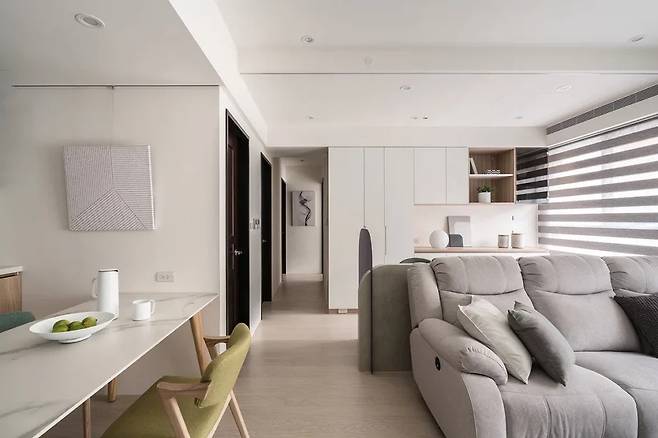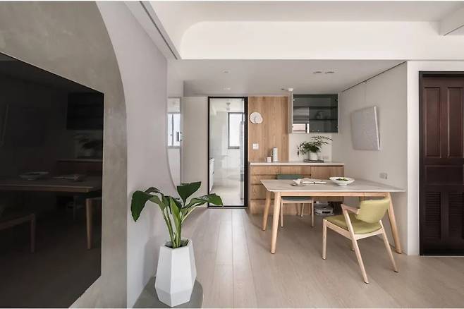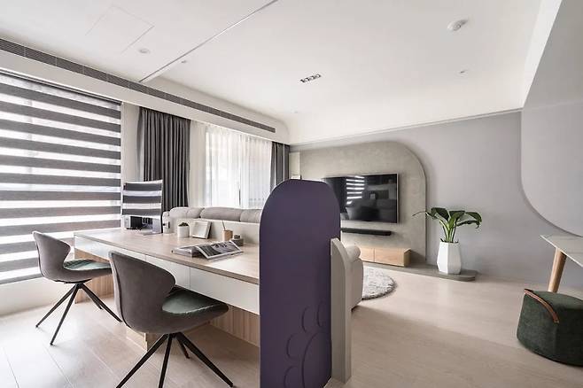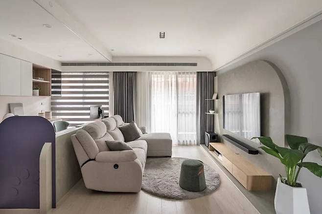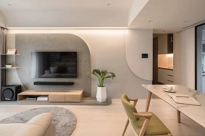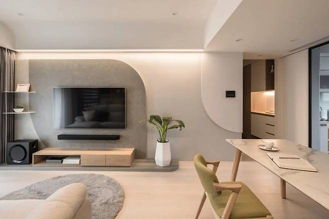 이 집의 중심은 거실입니다. 넓게 펼쳐진 연회색 벽이 공간의 기초를 형성하며, 모서리를 부드럽게 다듬어 전체 분위기를 더욱 부드럽게 만들어 줍니다. 천장과 벽의 접점에 설치된 곡선형 간접 조명은 따뜻한 노란빛을 발산하여 아늑함을 더합니다.