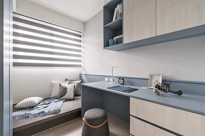 두 개의 보조 침실은 각각 다른 분위기로 꾸며져 있습니다. 모란디 블루와 소나무 그린 컬러를 포인트로 사용하여 차분하면서도 아이들만의 개성을 살렸습니다. 충분한 수납 공간을 확보해 장난감이나 소품을 자연스럽게 정리할 수 있으며, 시간이 지나도 쉽게 질리지 않는 안정적인 색감으로 마무리되었습니다.