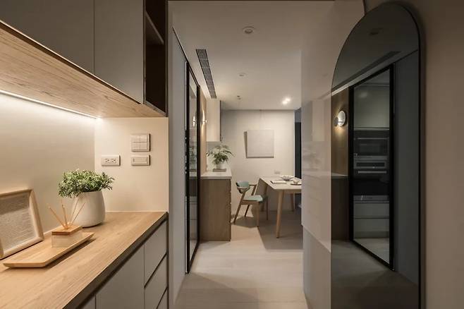 회색 거울은 단순한 전신거울을 넘어 화장대로도 활용할 수 있도록 실용성을 높였으며, 벽등에서 은은하게 반사되는 빛이 긴 현관을 가득 채워 밝고 포근한 첫인상을 남깁니다.