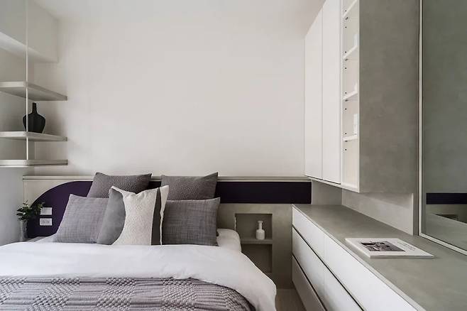 안방은 공용 공간의 연장선이면서도 더 차분하게 정돈된 공간입니다. 회색과 흰색을 기본으로 하면서, 질감이 살아있는 페인트를 사용해 편안하면서도 깊이 있는 분위기를 조성했습니다. 헤드보드 옆에는 곡선으로 마감된 선반을 배치하여 애매한 공간을 자연스럽게 활용했습니다.