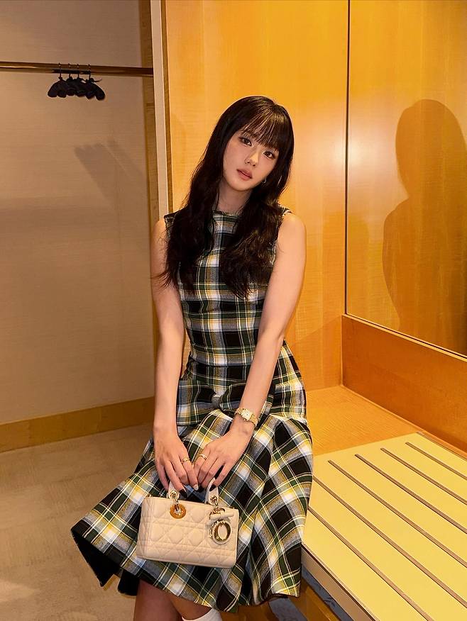사진 속 지수 씨는 체크 패턴의 슬리브리스 의상과 함께 풍성한 컬이 들어간 헤어스타일을 매치했는데요.