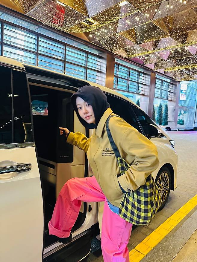 그녀는 베이지색 점퍼에 검은색 후드티를 레이어드하고 강렬한 핑크색 팬츠를 매치했습니다.