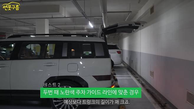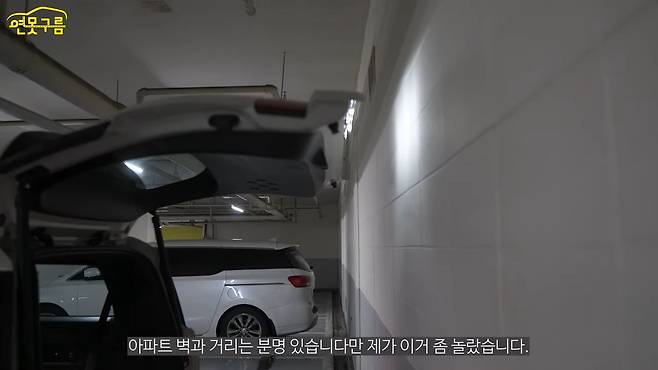 서라운드 뷰를 통해서 차량 끝이 스토퍼와 거의 맞닿은 것을 확인할 수 있는데 외부에서 보니 딱 이 상태입니다. 그럼 이번에 트렁크를 열어볼게요.