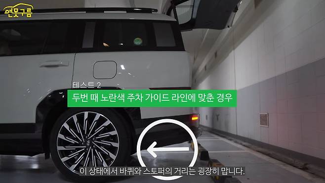 스토퍼가 이쪽에 있고 두 번째 경고 라인이 이쪽의 끝에 맞췄습니다. 이랬을 때 미리 보면 스토퍼와 차량 뒷끝이 거의 만나는 것을 알 수 있고요. 과연 직접 보면 어떨까요?