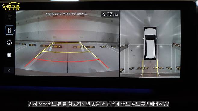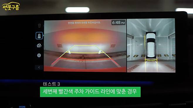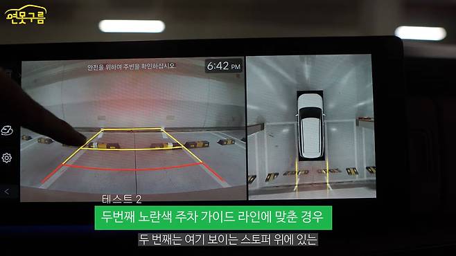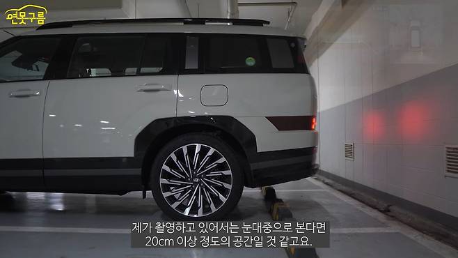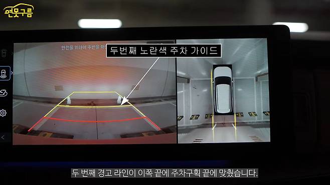 그런데 서라운드 뷰가 너무 익숙하기 때문에 서라운드 뷰를 믿는 것이 가장 좋고요. 그래서 아마 서라운드 뷰에서 1차, 2차, 3차까지 경고하게 되는데, 마지막 3차, 레드 라인이 저는 마진이라고 생각합니다. 다시 한번 말씀드리지만 바퀴 뒤에 있는 스토퍼는 다양한 환경에서 다르기 때문에 스토퍼를 기준으로 맞춘다면 자칫 정말 사랑하는 에마에 손상을 입힐 수 있습니다.