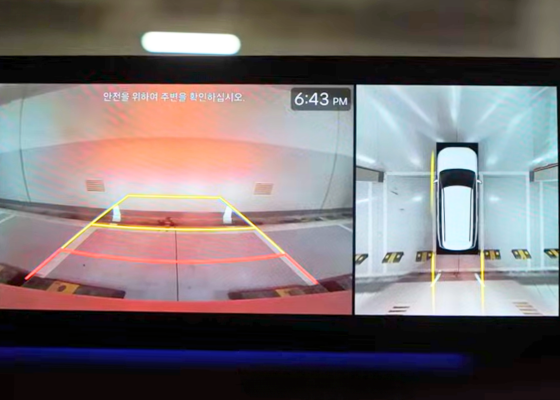 먼저 서라운드 뷰를 참고하시면 좋을 것 같은데 어느 정도 후진해야지 이 트렁크가 닿지 않을까요? 그리고 함께 보셔야 될 게 후진했을 때 이렇게 경고로 도움을 주잖아요. 빨간색은 데드라인인데요. 조금씩 이동해 볼게요.