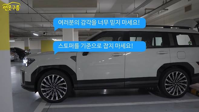 첫 번째, 눈대중으로 여러분 믿지 마세요. 그리고 두 번째, 이 스토퍼 믿지 마십시오. 왜냐하면 스토퍼가 규격은 있고 거리 간격은 분명히 있습니다만, 이 스토퍼들도 아파트에 따라서 좀 차이가 있고요. 야외인지, 마트인지에 따라서도 제가 측정해 보니까 좀 다르더라고요. 그래서 결론은 가장 믿을만한 것은 여러분의 감은 절대 아닙니다. 예전에는 뒤를 보면서 직접 후진도 하셨잖아요.