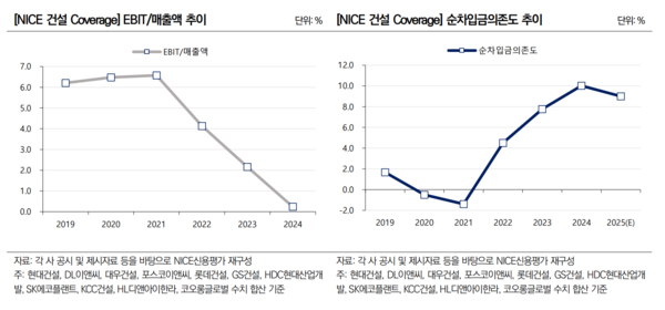 나신평은 유동성 확보 능력에 따라 신용도가 차별화될 것으로 예상했다. PF 우발채무 관리로 인해 위험도가 높은 브리지론 규모는 감소했지만 착공에 따라 본PF 규모가 증가하고 있다. 주요 건설사(현대·DL·대우·포스코·롯데·GS·HDC·SK·KCC·HL·코오롱글로벌 등 11개, KCC건설 제외 연결기준)의 자본 대비 PF 우발채무 비율은 2022년 71.2%에서 2024년 76.1%로 상승했다. 분양률이 떨어지면 PF 우발채무 현실화 위험이 높아지며 재무 부담이 확대될 수 있다.