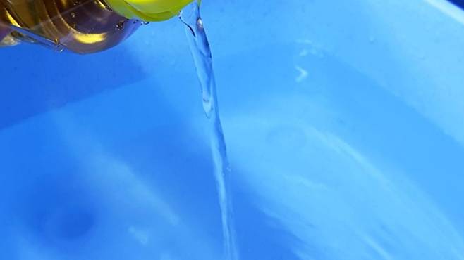 이제 대야에 물을 충분히 받고 식초를 적당히 부어 주세요. 그리고 냄새나는 컵을 모두 넣으세요.