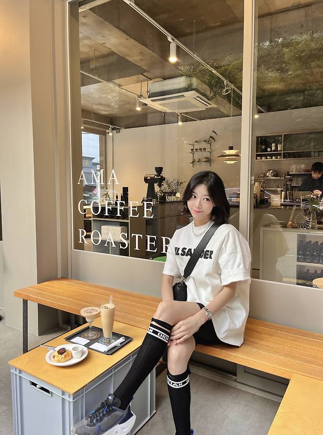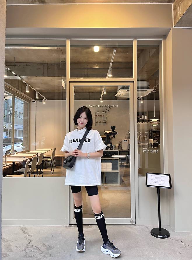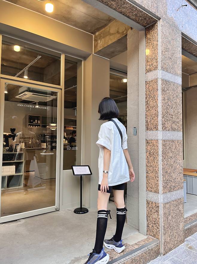 전체컷을 보시면 박시한 티셔츠 + 바이커 팬츠 + 니삭스 + 운동화 코디라