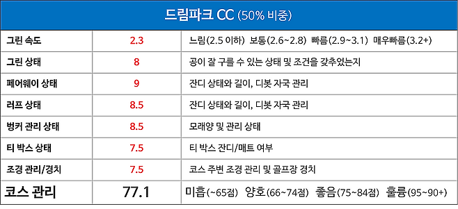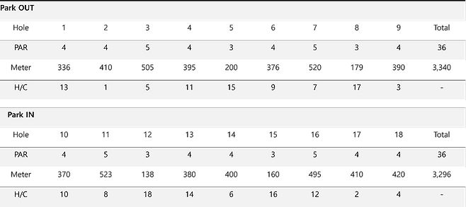 드림(18홀 6,429m), 파크(18홀 6,636m) 전장이며 잔디는 중지로 조성되어 있습니다. 코스는 랜덤으로 배정되고 파크가 조금 더 길고 난이도가 높은 코스로 평가됩니다.