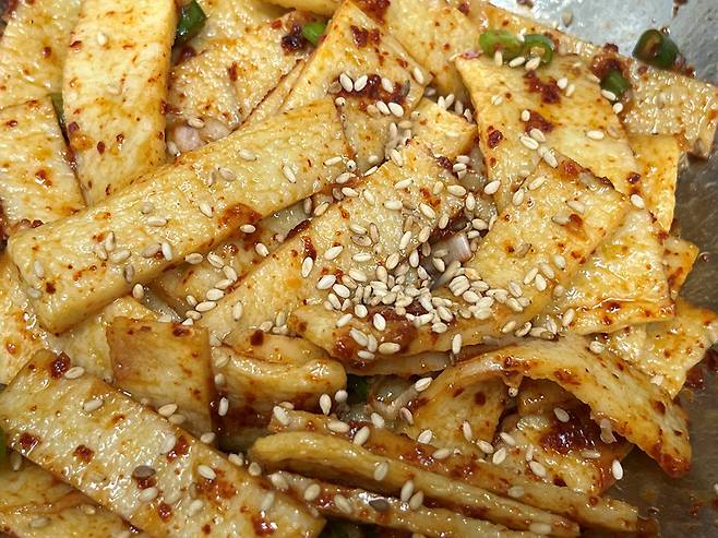 마지막에 통깨를 뿌려 완성하세요. 기름에 볶지 않아 더욱 담백하고, 어묵 식감이 살아있어 훨씬 맛있습니다.