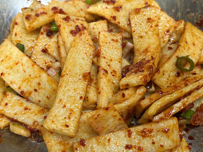 양념이 어묵에 배어 들도록 골고루 섞어 주세요. 어묵을 볶는 대신 무쳐서 만드는 어묵 무침이 완성됩니다.
