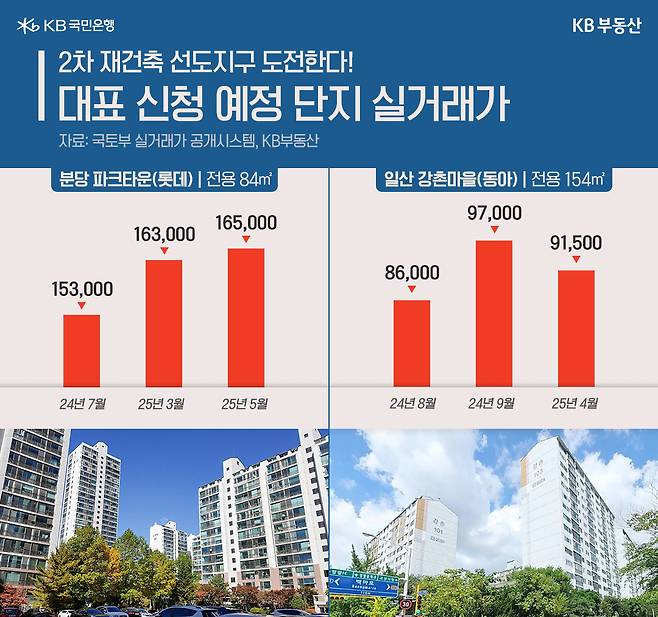 그럼 2차 선정에 도전하는 단지들의 집값 상황은 어떨지 살펴볼까요? 분당 수내동 파크타운은 롯데, 서안, 삼익, 대림 등이 모인 3,028가구 대단지인데요. 국토교통부 실거래가 공개시스템에 따르면, 파크타운(롯데) 전용 84㎡가 지난해 7월 15억3,000만원에 거래됐습니다. 올해 3월엔 16억3,000만원, 5월 16억5,000만원으로 실거래가가 계속 오르고 있습니다.