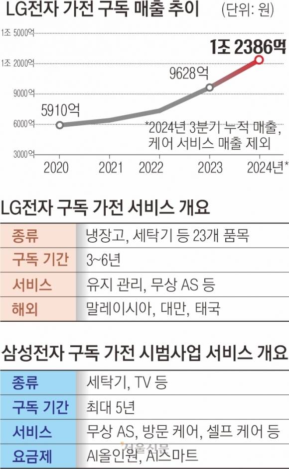 렌털·관리·제휴 서비스를 종합적으로 제공하는 ‘가전 구독’ 시장의 판이 커지고 있다. LG전자가 구독 서비스 매출 1조원을 돌파하며 가전업계의 새 지평을 연 가운데 삼성전자가 다음달 가전 구독에 뛰어든다. 가전업계는 위생에 대한 고객의 관심이 커졌지만 정기 관리를 힘들어한다는 점을 빠르게 파고드는 분위기다. 향후 기업들의 경쟁이 불을 뿜을 것으로 보인다.