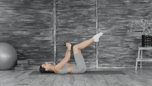 매트에 등을 대고 눕습니다. 손에는 아령이나 생수병을 들고 준비합니다. 다리를 공중으로 들어 무릎을 90도로 구부립니다. 손을 머리 뒤로 내리면서 왼쪽 다리를 앞으로 곧게 뻗습니다. 이번에는 손을 머리 뒤로 내리며 오른쪽 다리를 곧게 뻗습니다.