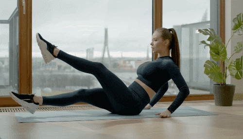 엉덩이를 매트에 대고 앉은 상태에서 손바닥을 바닥에 대어 상체를 지탱합니다. 상체를 약간 뒤로 기울이고 다리를 공중으로 들어줍니다. 오른쪽 다리를 위로 들어 올리고 왼쪽 다리는 아래로 내립니다. 오른쪽 다리를 내리면서 왼쪽 다리를 위로 들어 올립니다.