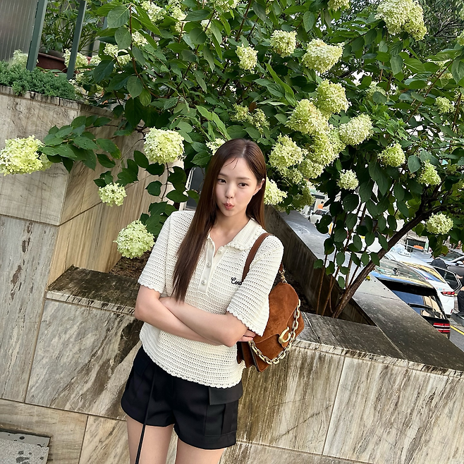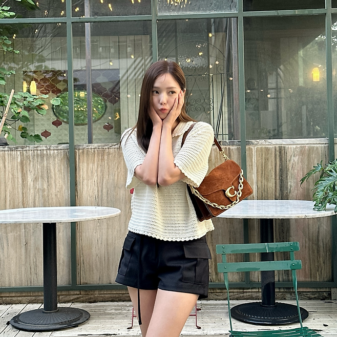 그녀는 아이보리 컬러의 짜임 니트 반팔과 검은색 쇼트 팬츠로 시원하면서도 세련된 여름 룩을 완성했습니다. 👗✨