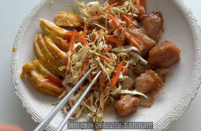 이시영은 "스윗깐풍 닭가슴살이 달콤한데, 이거를 같이 먹으면 엄청 상큼해요."라며 야채 샐러드를 만들었다. 그는 채썬 당근에 채썬 양상추, 거기에 사과식초(애사비) 머스타드 홀그레인, 올리브유, 알룰로스, 소금을 넣고 간단한 샐러드를 완성했다.