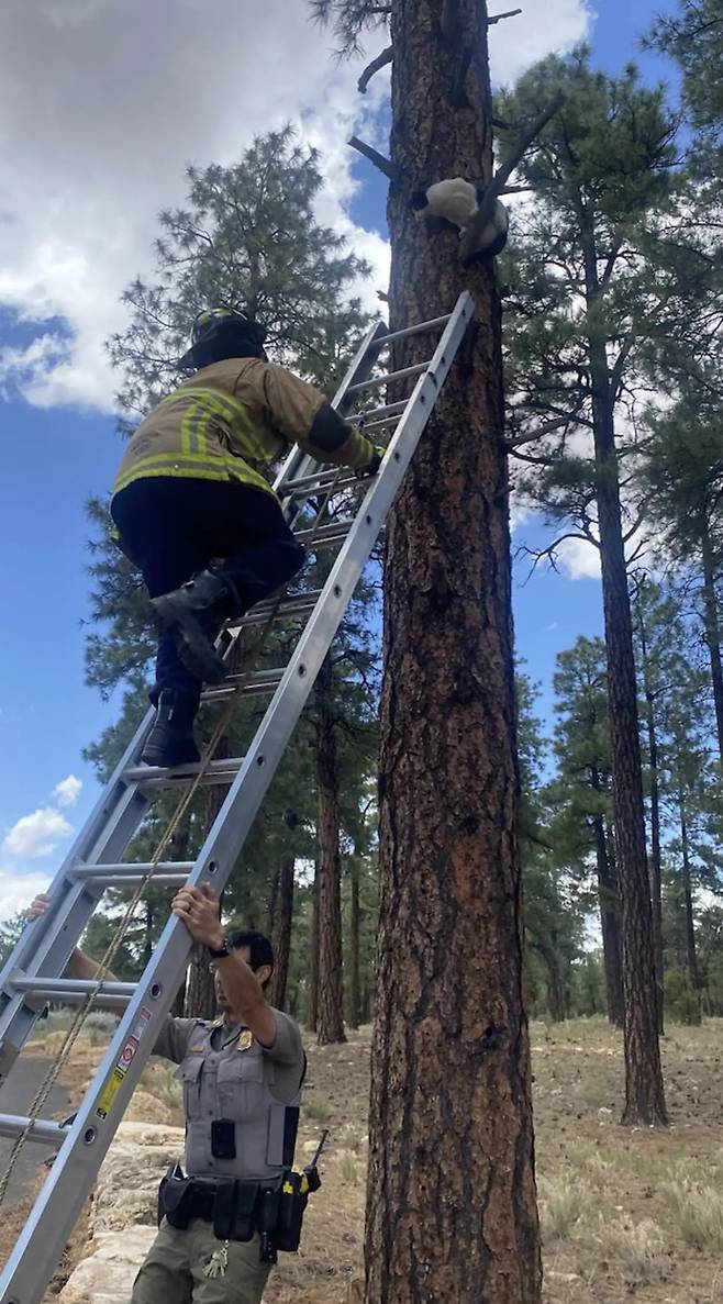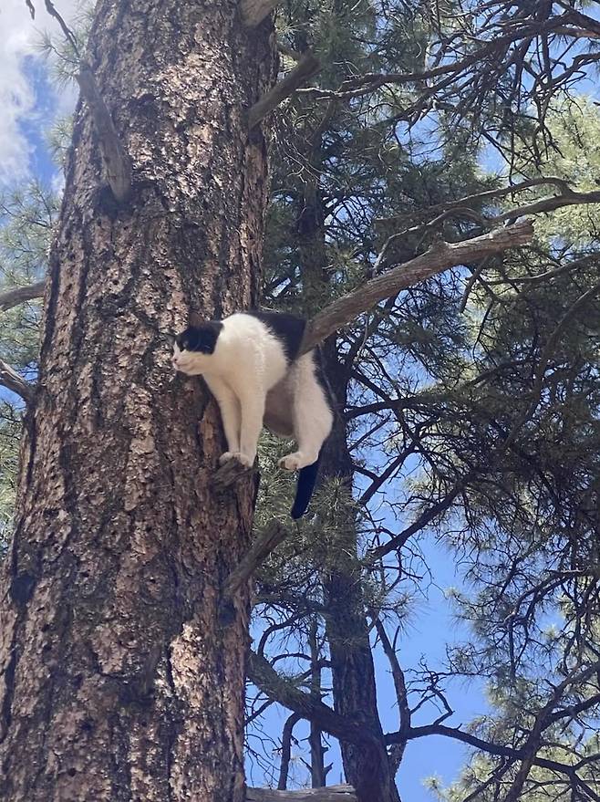 The Dodo에 따르면 지난 금요일, 그랜드 캐년 국립공원(GCNP) 소방관과 공원 관리인은 긴급 도움 요청을 받았습니다. 고양이 한 마리가 주거 지역에서 탈출했고, 겁에 질린 채로 거대한 나무 위 가지 하나에 갇혀있던 것이었습니다.