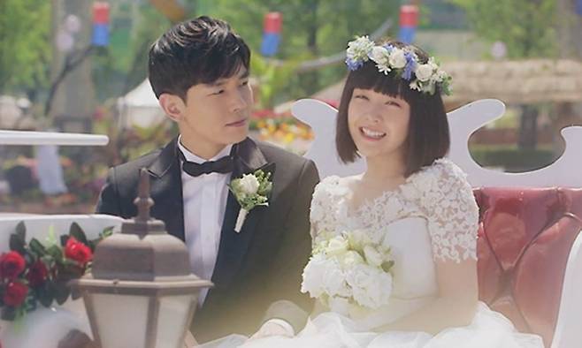 당시 민아(공심)는 새하얀 웨딩드레스와 화관을 쓰고 수줍은 미소를 지었다. 그런 민아를 감싸안은 온주완(석준수) 역시 환한 미소를 머금고 있다. 행복한 커플로 보이지만, 사실 이 결혼식은 극 중 민아의 상상이었다.