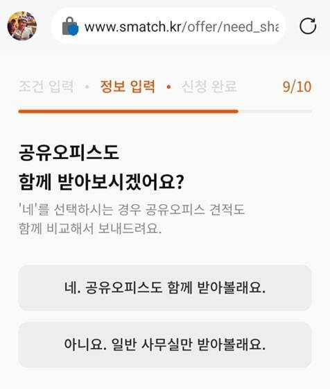 덕분에 ㅍㅍㅅㅅ도 실제 스매치 간증에 나설 수 있게 됐다. 중소규모 사무실을 구하길 원한다면, 밑져야 본전이다 치고 스매치 사이트에 들어가 보자. 최대 10개 지역과 원하는 사용 인원 / 평형, 그리고 기타 여러 사무실 조건을 입력하면 그걸로 끝. 기존 중개 서비스에서는 찾을 수 없었던, 내게 딱 맞는 매물들이 제안서 형태의 이메일로 바로 날아올 것이다.