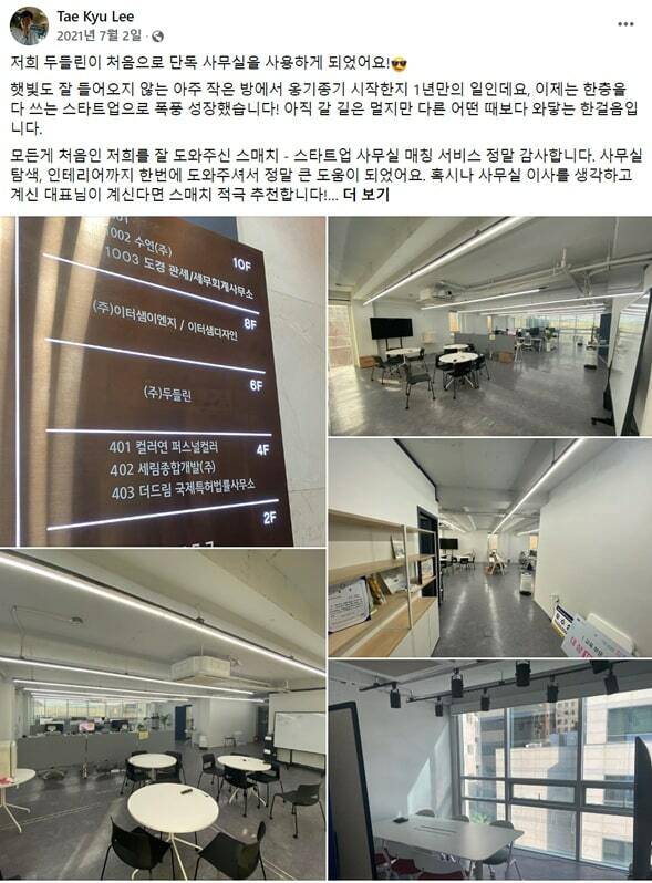 여기에 또 한 가지 장점, 필요하면 공유오피스도 잡아준다. 사실 공유오피스 돌아다니는 것도 정말 힘든 게, 온라인에 가격 공개하는 곳이 드물다. 전화해봐야 방문해달라는 답만 돌아온다. 하지만 스매치는 이것도 취합해서 알려준다. 더는 공유오피스 지점 여럿을 돌아다니며, 시간 낭비할 이유가 없다.
