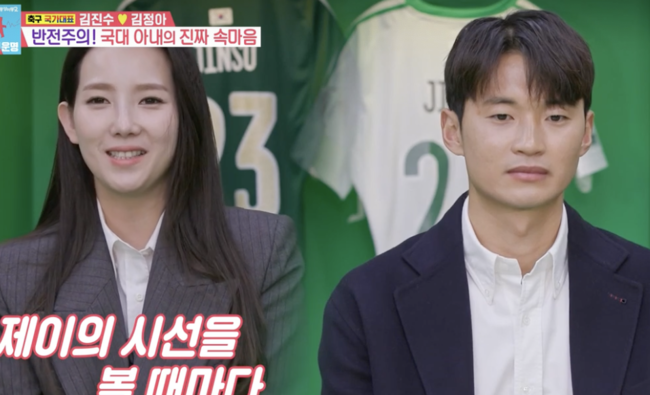 결혼 8년차, 축구 국가대표 김진수 선수가 재출연했다. 이어 아내 김정아도 함께 했다. 사실 6살 연상 연하 부부인 두 사람.김진수는 소속팀 클럽하우스 숙소에서 지내고 있었다. 아내는 "내가 쫓아냈다"고 했다. 알고보니 둘째 출산 후, 아기 울음소리 탓에 잠 못잘 남편을 배려한 것이었다.