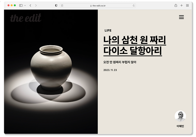 나의 꿈은 언제나 에디터가 되는 거였다. 고등학교 쉬는 시간 친구들이 수다를 떨고 만화를 읽을 때도 나는 보그를 보고 지큐를 읽었다. 도도한 걸음으로 바다 건너 파리의 패션위크를 거니는 모델들의 이름을 외우고, 끊임 없이 변하는 트렌드를 수학의 정석을 보듯 달달 외웠다. 너무 얇아서 자주 손가락이 베이는 종이 위에 펼쳐진 화보를 보면서 언젠가 나도 어른이 되어 이렇게 멋진 화보를 찍어야지 결심했다. 그리고 올해 여름, 디에디트의 에디터들은 복숭아 나무 대신 스튜디오의 조화 옆에서 사이트 리뉴얼을 결심한다. 올 한해 가장 큰 프로젝트였던, 무려 7년 만의 디에디트 웹사이트 리뉴얼의 시작이었다. 새로운 집을 만들었으니 다음은 손님에게 대접할 맛깔난 콘텐츠를 위해 고군분투했다. 멋있게만 보이고 싶은 건 아니었다. 미슐랭 레스토랑 리뷰부터 명동 길거리 음식까지, 단짠단짠, 온탕과 냉탕을 왔다 갔다 하면서 사이트에 들어오는 사람들의 혼을 쏙 빼놓고 싶었다. 3천 원 짜리 다이소 공산품을 오천만 원짜리 화보처럼 보이고 싶어서 매거진과 함께 작업하는 포토그래퍼를 섭외하고 플로리스트의 도움도 받았다. 다이소 달항아리는 올해의 기사로 뽑은 건 디에디트가 어떤 곳인지 가장 잘 보여주는 기획이다. 잡지를 동경하던 19살의 나에게 달항아리 기사를 보여주며 이렇게 말해주고 싶다. “혜민아, 20년 뒤에 네가 만든 걸 봐” 너무 자뻑인가?(그럼 어때)