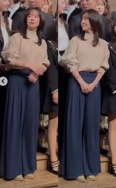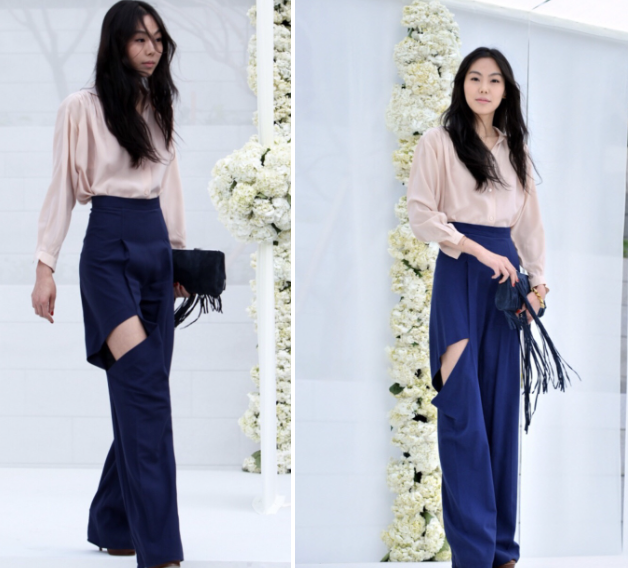 지금까지도 역대급 하객룩 중 하나로 뽑히는 13년 전 김민희 스타일링. 2만원대 보세 블라우스에 절개 디테일이 들어간 네이비 팬츠로 시크하고 세련된 하객룩을 완성. 블라우스에 정장팬츠 조합은 실패하기 참 어려운 조합이다.