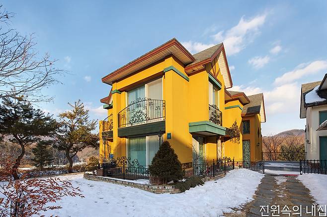태화산 줄기를 여유롭게 내려다보는 용인 정수리. 용인에서 제일 높은 곳이라는 이 지역에 작은 주택 단지가 자리한다. 입구로 들어서자 개나리꽃 핀 듯 환하게 인사하는 노란색 집과 금속으로 제작된 기타 모양의 장식 간판이 눈에 들어온다. 유럽 가정집의 분위기가 느껴지는 주택에는 우리나라 1세대 클래식 기타리스트 송형익 교수와 그의 부인 최병옥 씨가 살아가는 주거 공간, 그리고 공연 및 전시를 위한 아트홀이 구성되어 있다. 오랜 시간 서울 노원구에서 터전을 잡고 살아온 그는 약 3년 전 주택의 시원한 경관과 분위기에 반해 이사를 결정했다. 또 한 가지 이사를 결심한 이유 중 하나는 활용도가 높은 지하 공간이었다. 대지의 고저 차로 인해 지상층처럼 사용할 수 있는 지하는 원래 사우나가 설치된 휴식 공간으로 사용되고 있었다.
