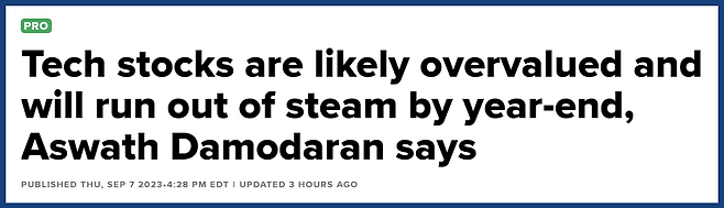 애스워드 다모다란은 ‘가치평가 학장’이라는 별명이 붙었을 정도로 월스트리트에선 가치평가의 대가로 불리는 사람이야. 엔비디아 랠리에 대해 회의적인 의견을 제시한 것으로도 유명하지! 이 분이 최근 CNBC에 나와서 기술 주식들이 너무 과열된 상태라고 이야기하고 있어.