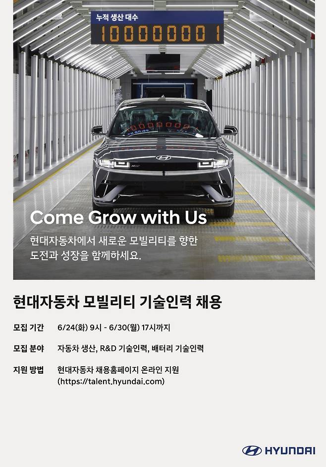 이번 채용에서 현대차는 자동차 생산, R&D 기술인력, 배터리 기술인력 등 3개 부문의 인재를 모집할 예정이다.
