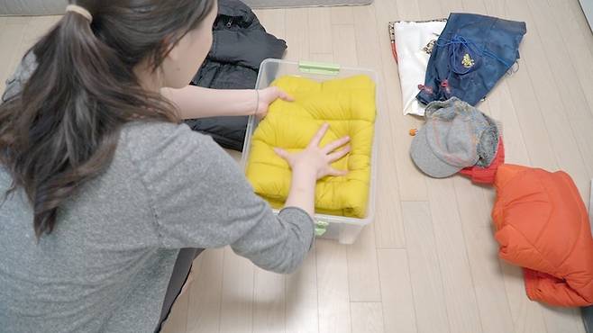 보관할 옷들 중에서 일 년에 한두 번 사용하게 되는 한복과 철 지난 두꺼운 패딩은 다이소 리빙박스에 정리했습니다.