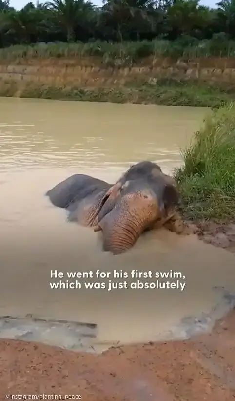 오랫동안 자신을 묶고 있던 사슬에서 벗어난 타이니는 근처 강으로 들어가 감격스러운 첫 수영을 했다.