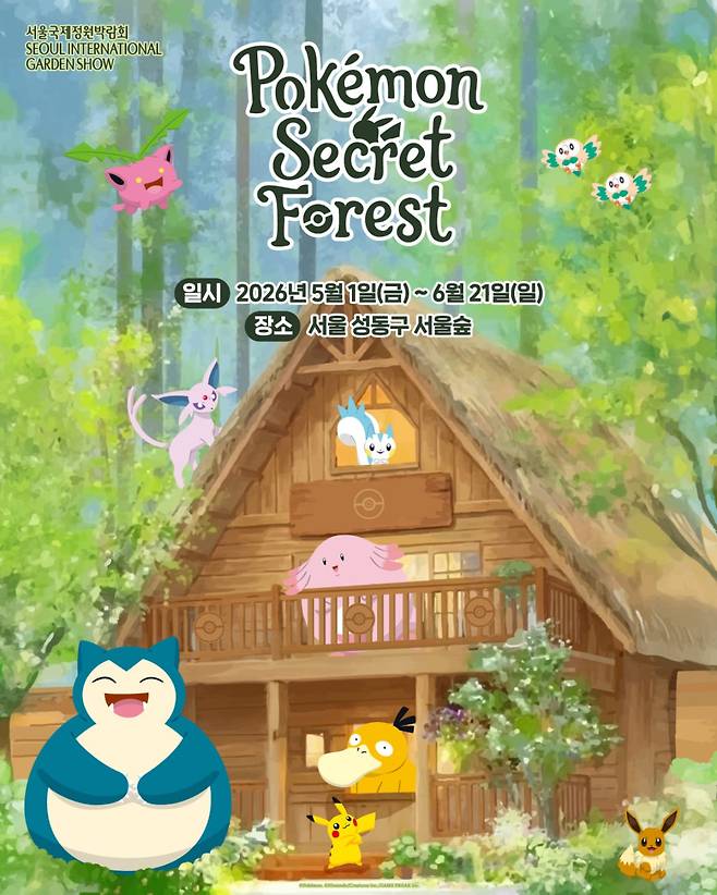 먼저, '포켓몬 시크릿 포레스트'가 5월 1일부터 6월 21일까지 서울 성동구 서울숲 공원에서 열리는 '2026 서울국제정원박람회'의 일환으로 조성된다.