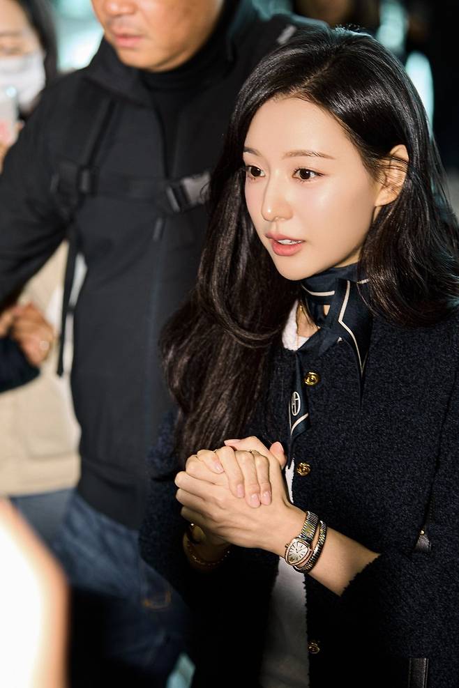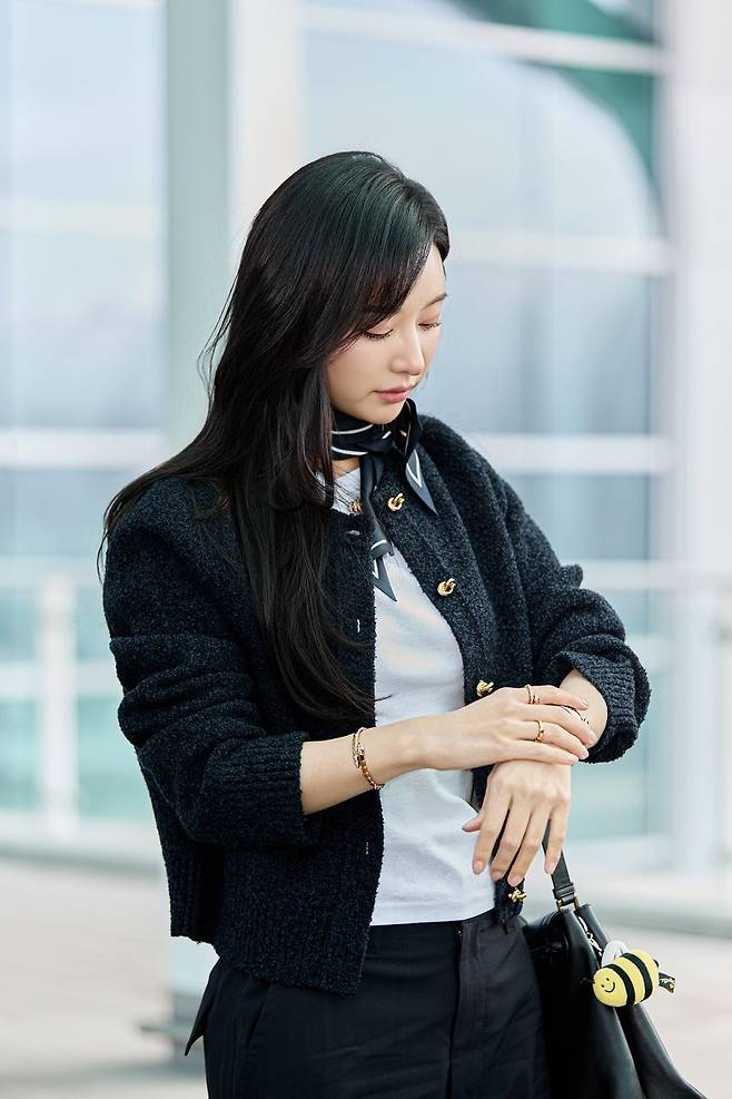 김지원은 화이트 티셔츠와 블랙 트위드 카디건을 매치한 세련된 룩을 완성했다. 여기에 블랙 팬츠와 실크 스카프를 더해 우아하면서도 클래식한 분위기를 자아냈다. 특히 손목을 감싸는 불가리 세르펜티 투보가스 워치는 그의 스타일에 강렬한 포인트를 더했다.